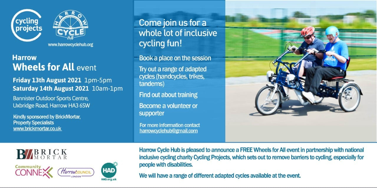 Our vision at Cycling Projects is to remove barriers to activity, especially for people with disabilities, and together working in Partnership with Harrow Cycle Hub we will focus on enabling more people to be active through cycling, with the plan to create a regular inclusive cycling offer for Harrow.