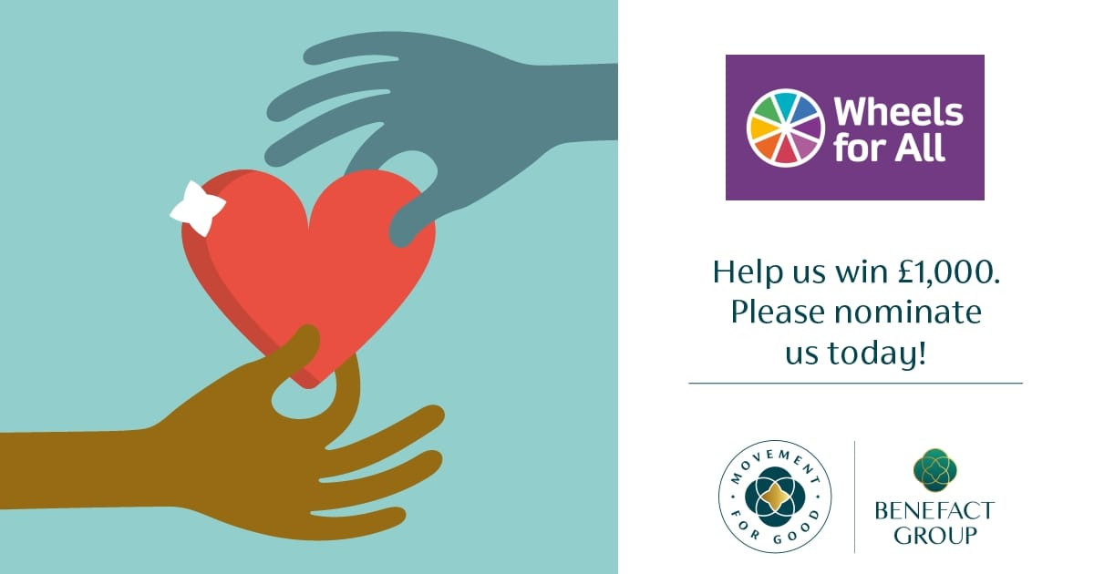 We’re thrilled to announce that Wheels for All has the chance to receive a generous £1000 donation from Movement for Good! But we need YOUR help to make it happen!