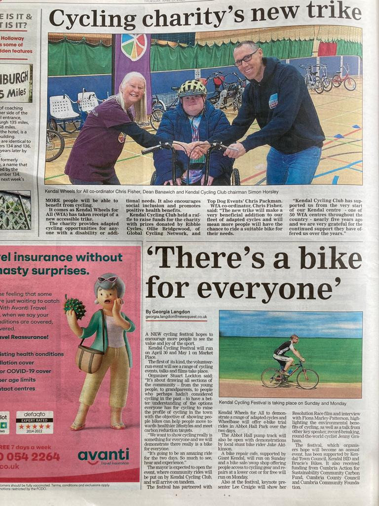 “The new trike is a wonderful addition to our fleet of adapted cycles and will mean more people will have the opportunity to ride a suitable bike,” says Chris Fisher, Wheels for All Kendal Co-ordinator.