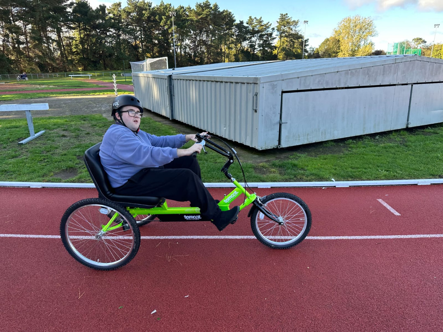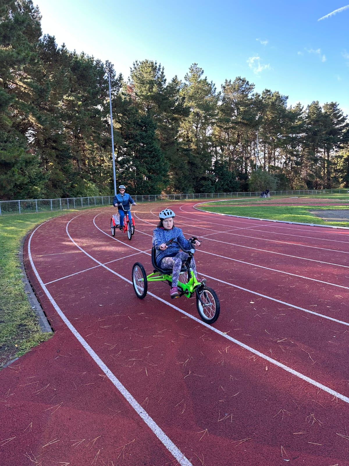 Because there were so many bikes out on the track, rather than waiting for one of the hand-bikes to come back, and also perhaps not feeling overwhelmed by too many choices, she was happy to have a go on something different and absolutely LOVED it.