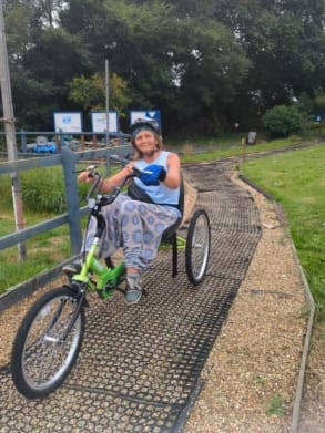 In 2023, Wheels for All, in partnership with the Sailship Training and Learning for Life Centre in Clacton, launched a small but impactful Hub to provide inclusive cycling opportunities to the trainees at Sailship, as well as the wider community. Nestled in a beautiful setting surrounded by allotments and a small, wooded area, Sailship features an accessible pathway designed specifically for wheelchairs, cycles, and walking aids. Deborah is one of our participants at Sailship and the benefit of the Hub has been massive for her…