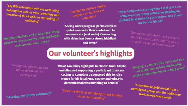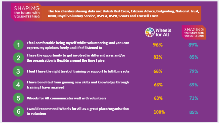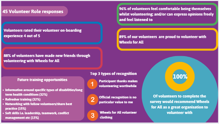 Volunteer retention: As a charity we pride ourselves on creating welcoming spaces for everyone so we were delighted to see that 96% of our volunteers feel comfortable being themselves whilst volunteering with us; and/or can express opinions freely and feel listened to. It was also fantastic learning of the social benefits our volunteers have gained including 88% of volunteers reporting they have new friends through volunteering with Wheels for All.