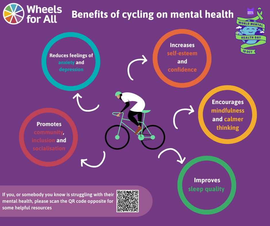 As we focus our attention on World Mental Health Day 2024, it’s essential to shine a light on how simple activities, like cycling, can have profound effects on mental well-being. At Wheels for All, we believe cycling is for everyone—regardless of age, ability, or background. But cycling isn’t just a means of transportation or physical exercise; it can also be a powerful tool for improving mental health. Here are five benefits of cycling that directly contribute to a healthier mind.